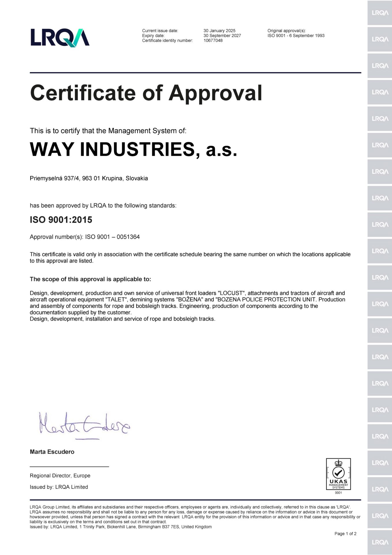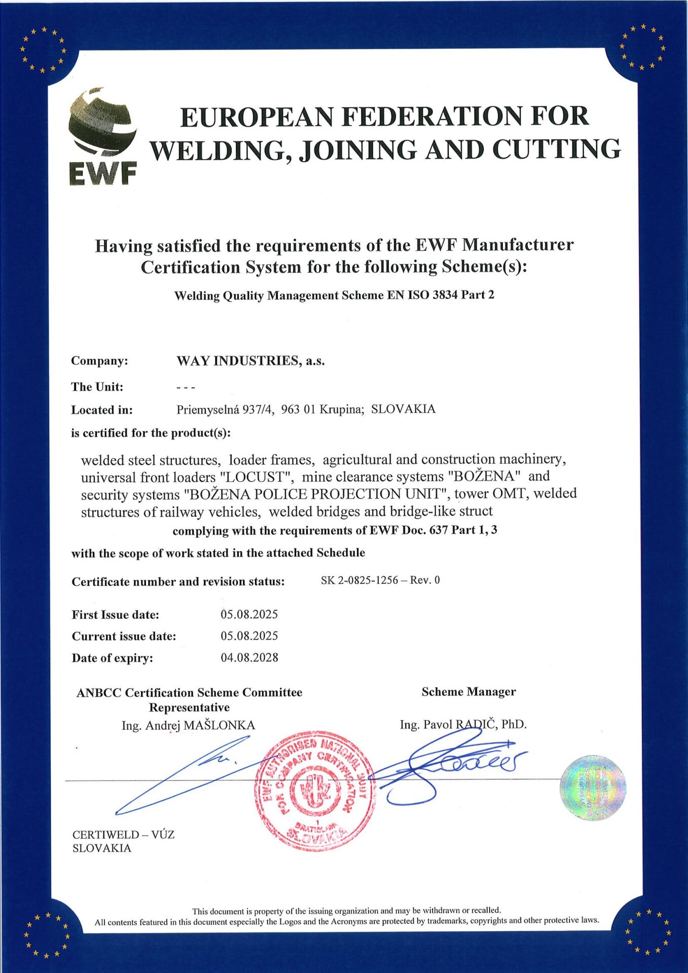 Way Industries is a manufacturing company with more than 50 years of experience in the production and assembly of civil and military vehicles and related services. In its beginning, components for the engineering industry began to be produced in the company's premises. Over time, the company wanted to upgrade its production and bring customers higher added value and invent a product that would reach the pinnacle of innovation in the territory of the Slovak Republic. We launched the production of skid steer loaders, which achieved a high rate of annual productivity. After obtaining various certificates and certifications, the company launched the production of a unique product - the Božena demining system, thus gaining global leadership in its production industry. Currently, the company is primarily engaged in the production of LOCUST loaders and Bozena demining systems, which it regularly improves and innovates, thereby offering the customer the facilitation of hard work in any conditions and the protection of his safety in dangerous, life-threatening situations.