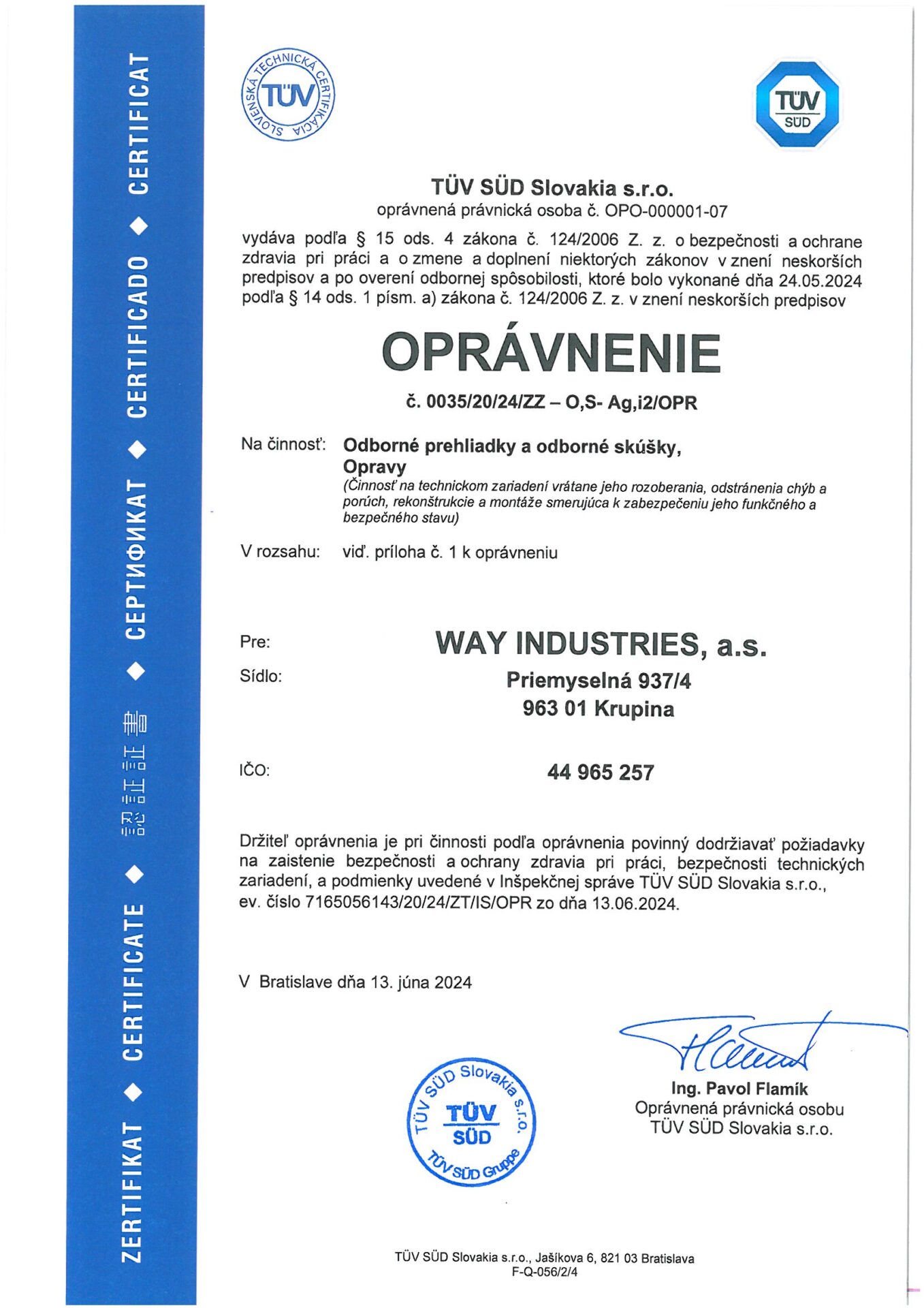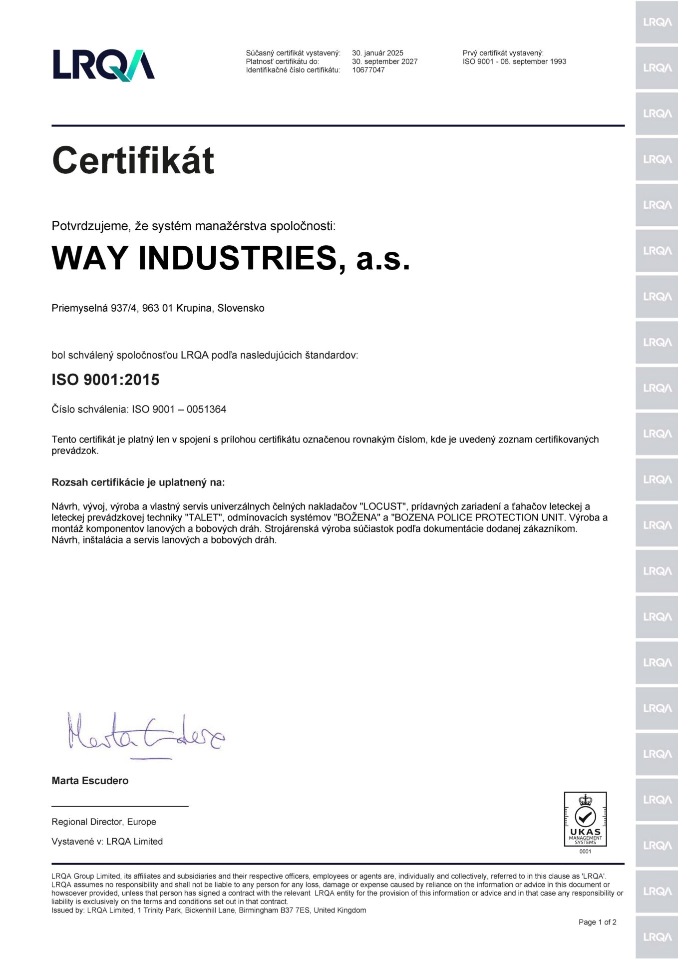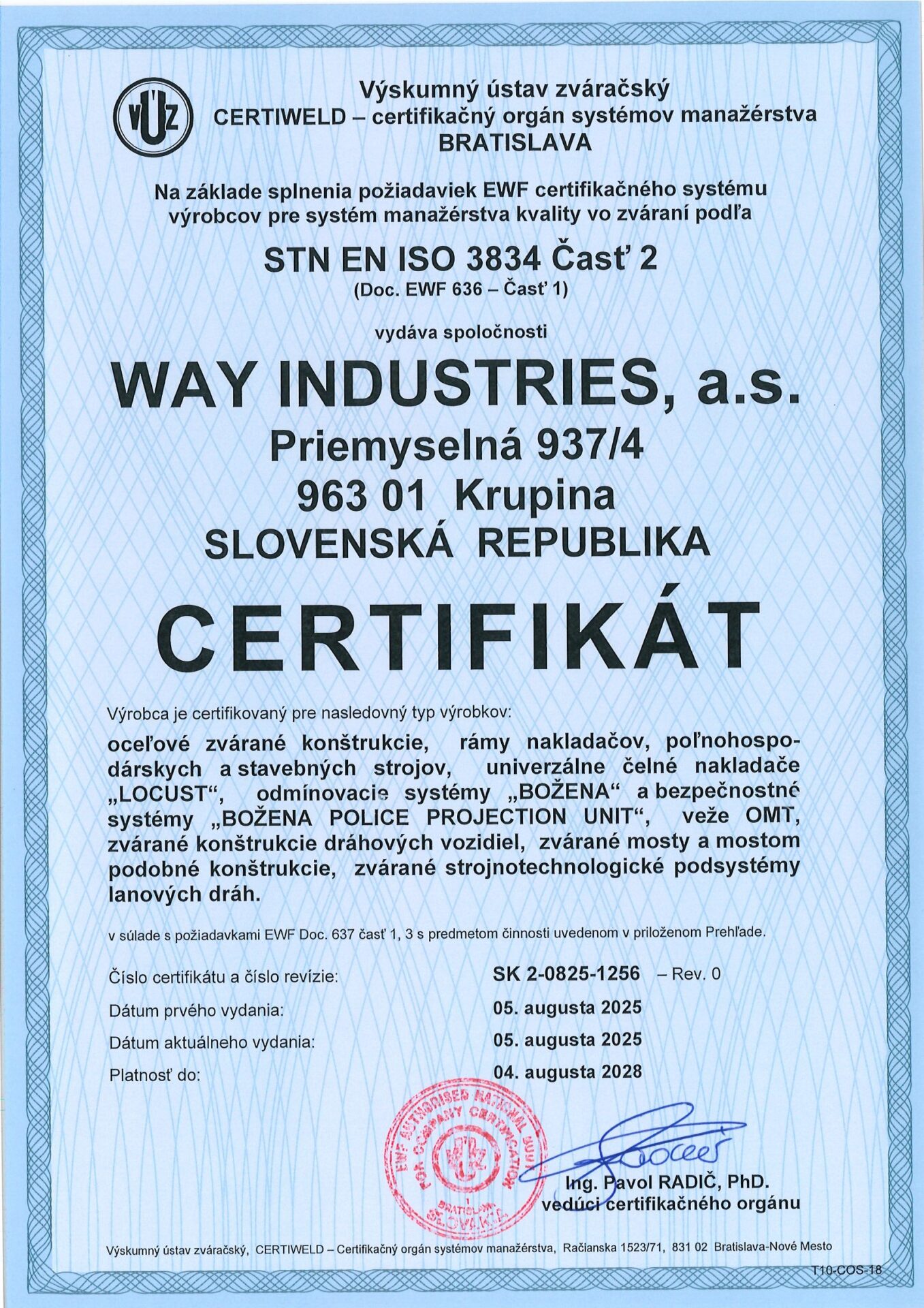Way Industries je výrobná spoločnosť s viac ako 50 rokmi skúseností v oblasti výroby a montáže civilných a vojenských vozidiel a s nimi spojených služieb. V jej počiatku sa v priestoroch spoločnosti začali vyrábať komponenty pre strojársky priemysel. Časom chcela spoločnosť svoju výrobu povýšiť a priniesť zákazníkom vyššiu pridanú hodnotu a vymyslieť produkt, ktorý dosiahne vrchol inovácií na území Slovenskej republiky. Spustili sme výrobu šmykom riadených nakladačov, ktorá dosiahla vysokú mieru ročnej produktivity. Po získaní rôznych certifikátov a osvedčení spoločnosť spustila výrobu unikátneho výrobku – odmínovacieho systému Božena, čím si získala celosvetové líderstvo vo svojom výrobnom odvetví. V aktuálnej dobe sa firma primárne venuje výrobe nakladačov LOCUST a odmínovacích systémov Božena, ktoré pravidelne zlepšuje a inovuje a tým ponúka zákazníkovi uľahčovanie tvrdej práce v akýchkoľvek podmienkach a ochranu jeho bezpečia v nebezpečných, život ohrozujúcich situáciách.